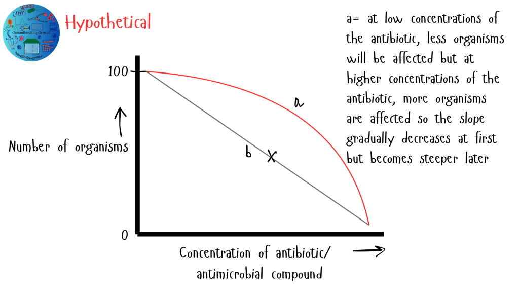 Another simple concept- higher the concentration of antibiotic, lesser the number of surviving organisms. The slope of the graph should show a decline.