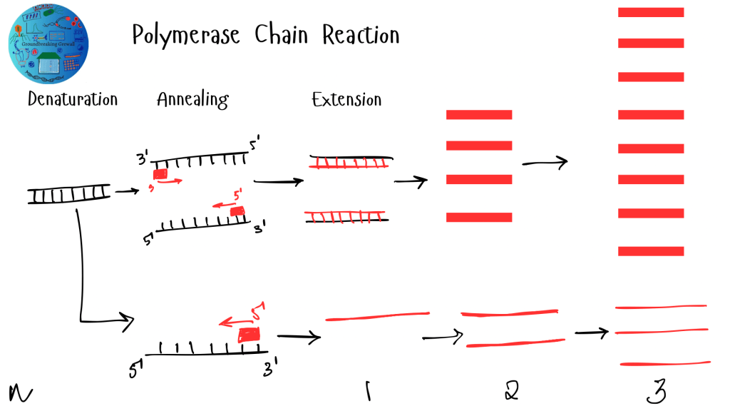 A PCR reaction is divided into three steps- denaturation, annealing of primers and extension. There are two primers, the forward and reverse.